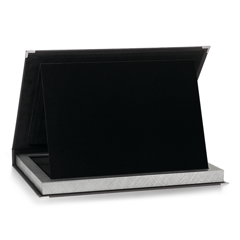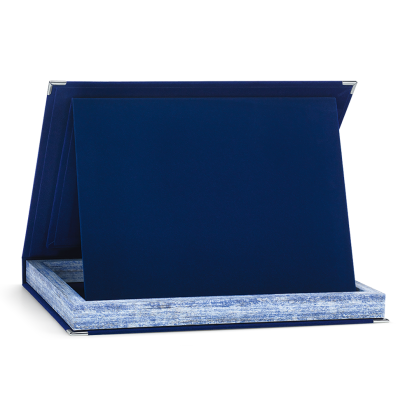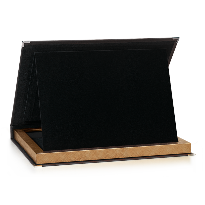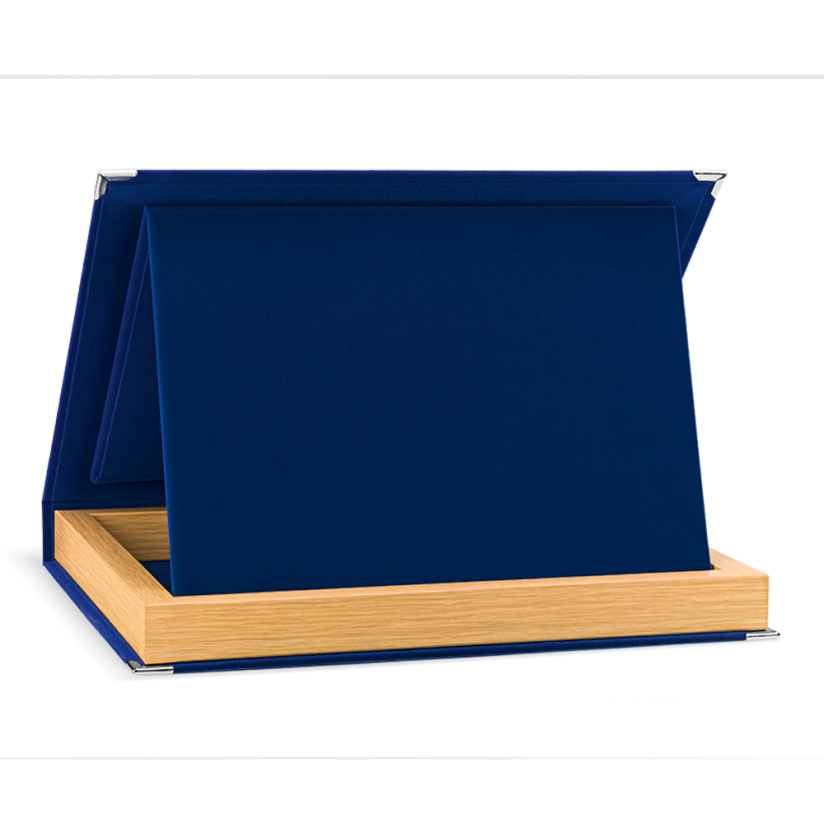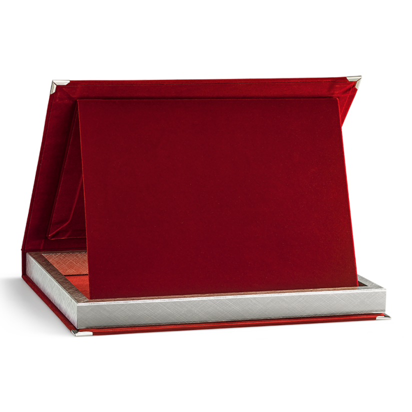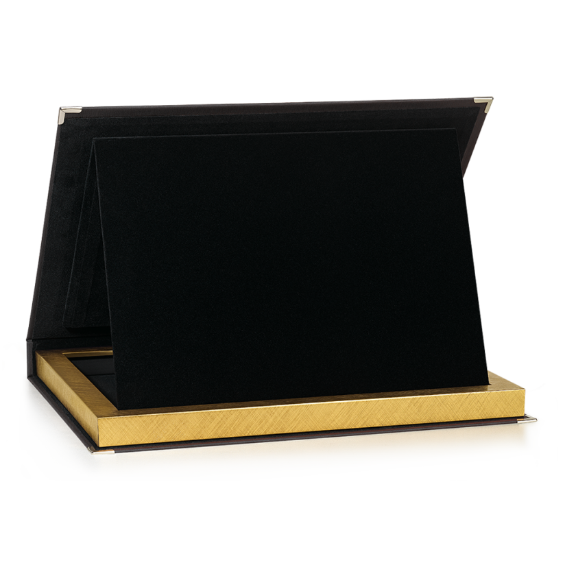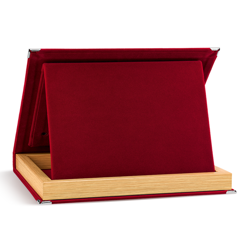 Design essenziale e dettagli contemporanei si uniscono in una linea di astucci in velluto per targhe premio dal gusto attuale, arricchiti da inserti metallici o in legno.